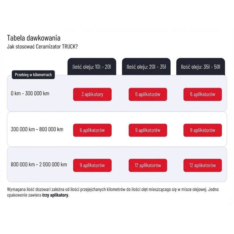 Produkt został opracowany zarówno dla profesjonalnych warsztatów samochodowych, jak i dla majsterkowiczów garażowych, którzy samodzielnie dbają o silniki diesla o dużych pojemnościach i wysokich przebiegach. Ceramizator Truck działa bezpośrednio w układzie smarowania, tworząc ochronną warstwę ceramiczną na powierzchniach trących.