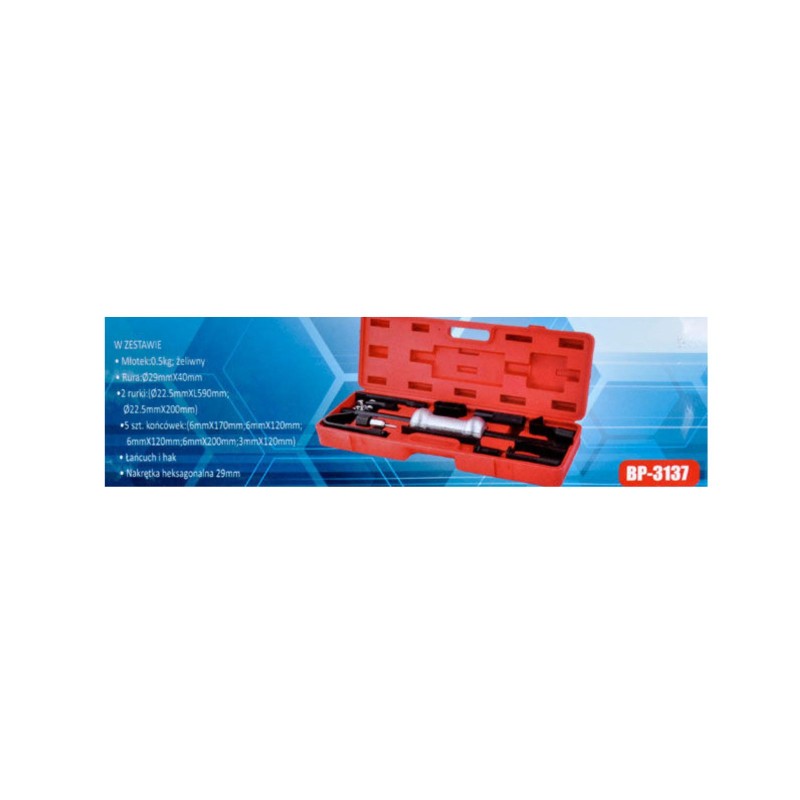 W zestawie znajduje się młotek bezwładnościowy do łożysk, który dzięki odpowiednio dobranej wadze i długości gwarantuje skuteczne przeniesienie energii uderzenia bez uszkodzenia elementów.