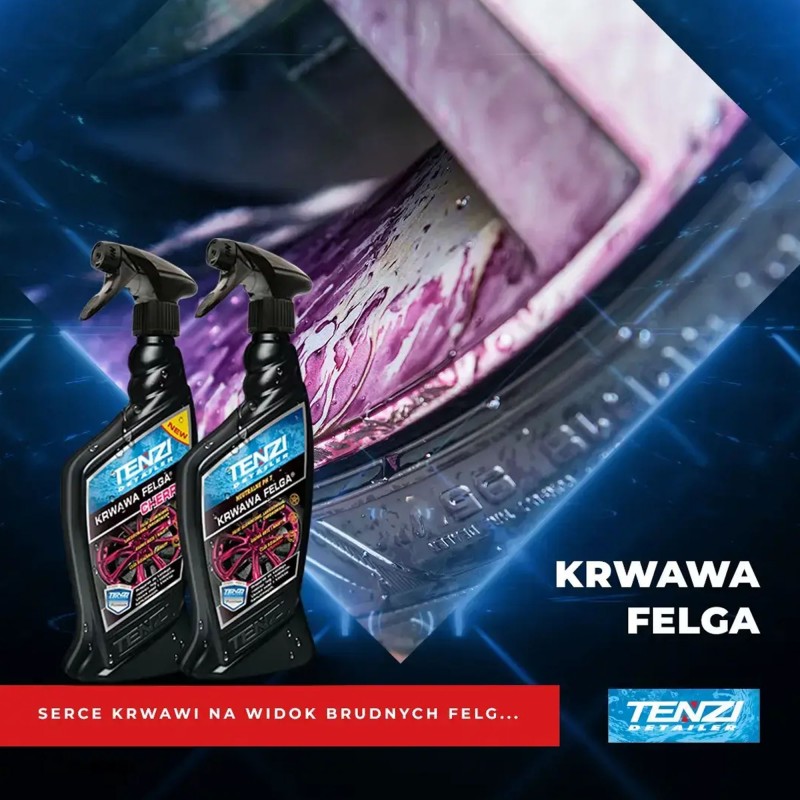 Marzysz o felgach, które lśnią jak nowe, wolne od uporczywego pyłu hamulcowego i metalicznych zanieczyszczeń? Poznaj TENZI Krwawa Felga 0,6L – nowatorski i profesjonalny preparat, który nie tylko skutecznie czyści, ale także dostarcza spektakularnego wizualnego dowodu na swoje działanie! Brud na felgach to zmora każdego kierowcy. Szczególnie uciążliwe są osady z klocków hamulcowych i rdzę. Zwykłe mycie często nie wystarcza. TENZI Krwawa Felga to rozwiązanie, które zmienia zasady gry. Dzięki niemu zobaczysz, jak bardzo Twoje felgi potrzebowały gruntownego czyszczenia, a efekt końcowy zachwyci Cię nieskazitelnym blaskiem.